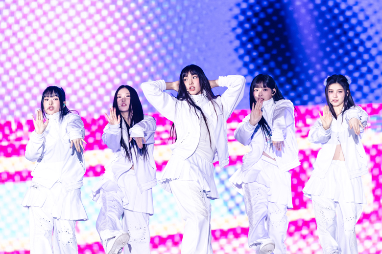 登場と共に大歓声が上がり、さすがの人気ぶりを見せつけたのはNewJeans(2025年2月にNJZに改名)。残念ながら現在は活動を休止しているが、この日はジャージークラブのリズムと弾けるビートが印象的な楽曲「Super Shy」や、2023年の日本レコード大賞でW受賞した「Ditto」「ETA」といったヒットナンバーを披露。「Cookie」では客席に降りてファンと触れ合うサプライズでも熱狂させた。