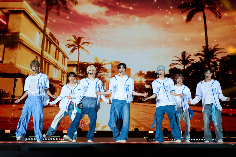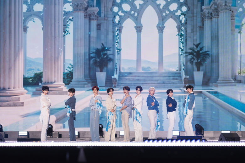 そうした勢いのある"第5世代"の中でもトップランナーというべき存在が、中盤に登場した9人組グループ・ZEROBASEONE。7月10日でデビュー2周年と、勢いをますます加速させる中、カリスマオーラを放つ彼らが姿を現すやいなや観客は熱狂。ブルーや白を基調とした爽やかな衣装で、序盤から清涼感溢れるステージで駆け抜けた。