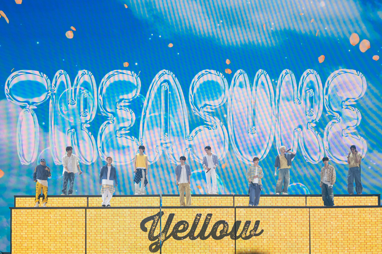 幻想的なオープニング演出で幕を開けたのは、8月でデビュー5周年を迎える10人組グループ・TREASUREだ。清々しい青空の映像をバックに「YELLOW」でライブをスタートさせた彼らは、会場全体をハッピーな空気に染め上げる。