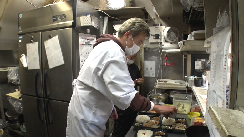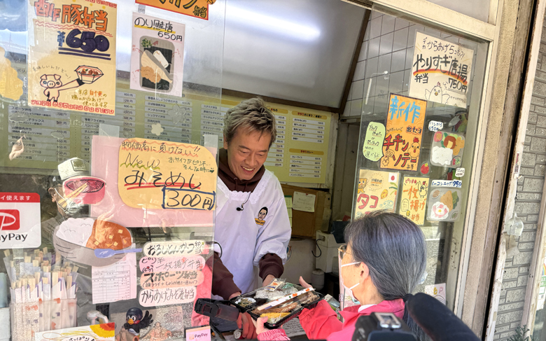 2軒目は、千葉県・勝浦市の海鮮弁当屋さん。朝から仕込みを手伝い、配達用の大量のお弁当を準備する。1軒目の経験をさっそく生かし、「呼び込みをしよう」と自ら動いたり、「チャーシュー丼ならすぐできます」とアピールをするなど、お客さんとのコミュニケーションもより流暢に。老若男女を問わず、幅広い層の町の人々ともフレンドリーに応対。ドラマや映画で見せる"強面"ぶりは見る影もなく、人好きする気さくな人柄が際立ってくる。