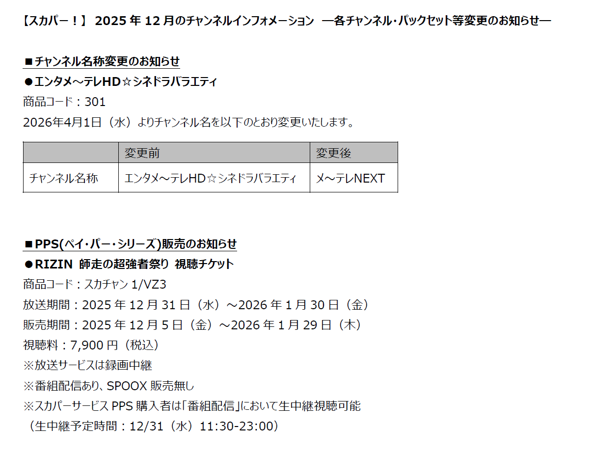 【スカパー!サービス】2025年12月のチャンネルインフォメーション ―各チャンネル・パックセット等変更のお知らせ―