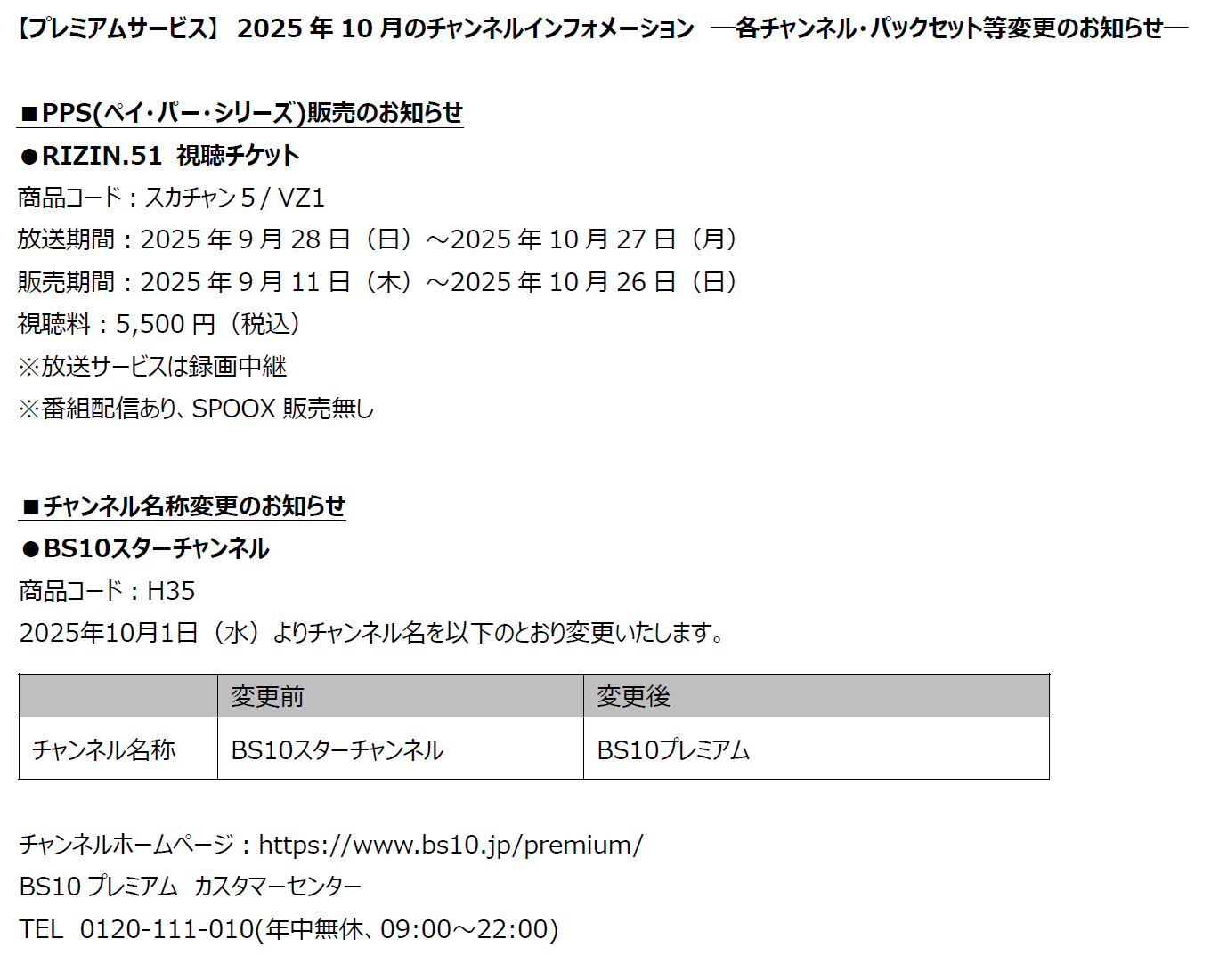 【プレミアムサービス】2025年10月のチャンネルインフォメーション ―各チャンネル・パックセット等変更のお知らせ―