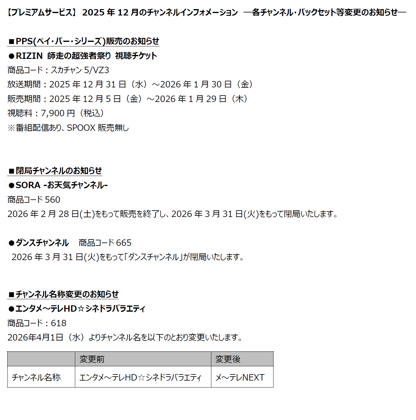 【スカパー!サービス】2025年12月のチャンネルインフォメーション ―各チャンネル・パックセット等変更のお知らせ―