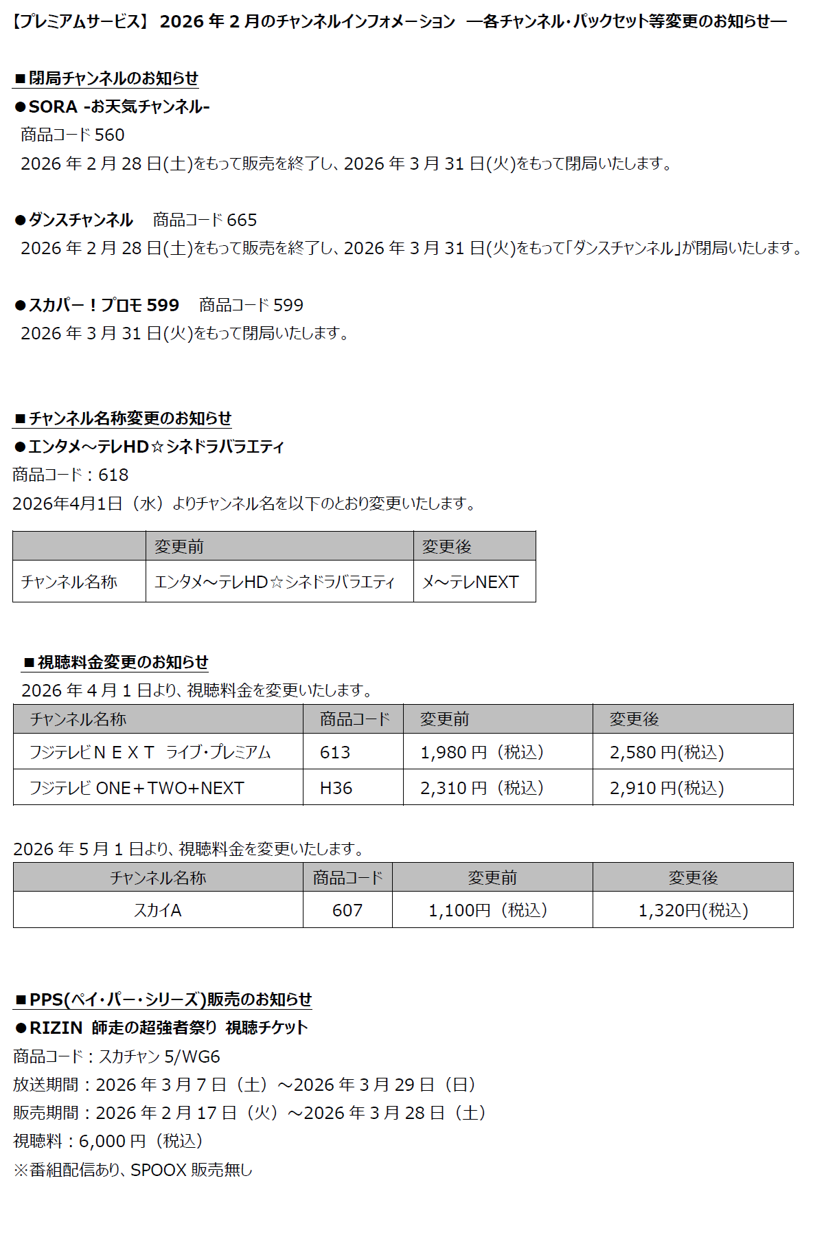【プレミアムサービス】2026年2月のチャンネルインフォメーション ―各チャンネル・パックセット等変更のお知らせ―