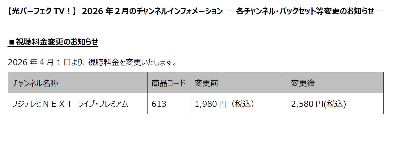 【プレミアムサービス光】2026年2月のチャンネルインフォメーション ―各チャンネル・パックセット等変更のお知らせ―