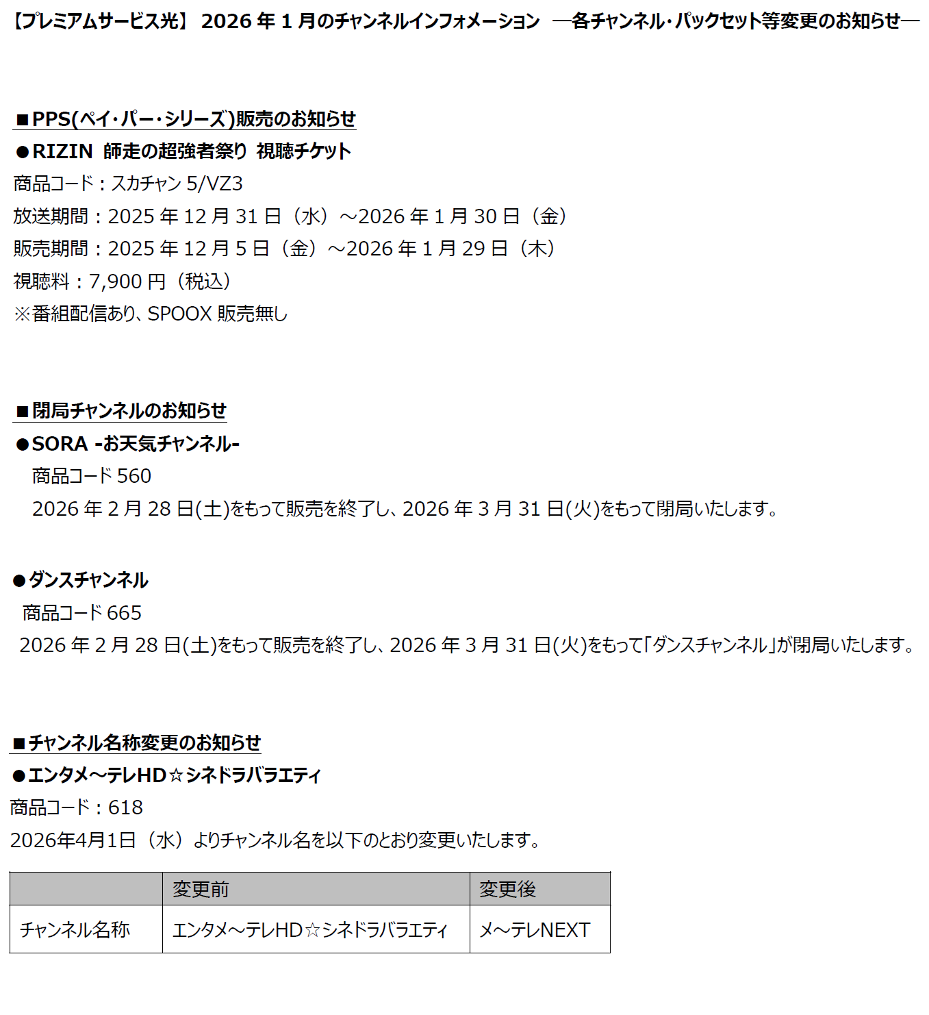 【プレミアムサービス光】2026年1月のチャンネルインフォメーション ―各チャンネル・パックセット等変更のお知らせ―