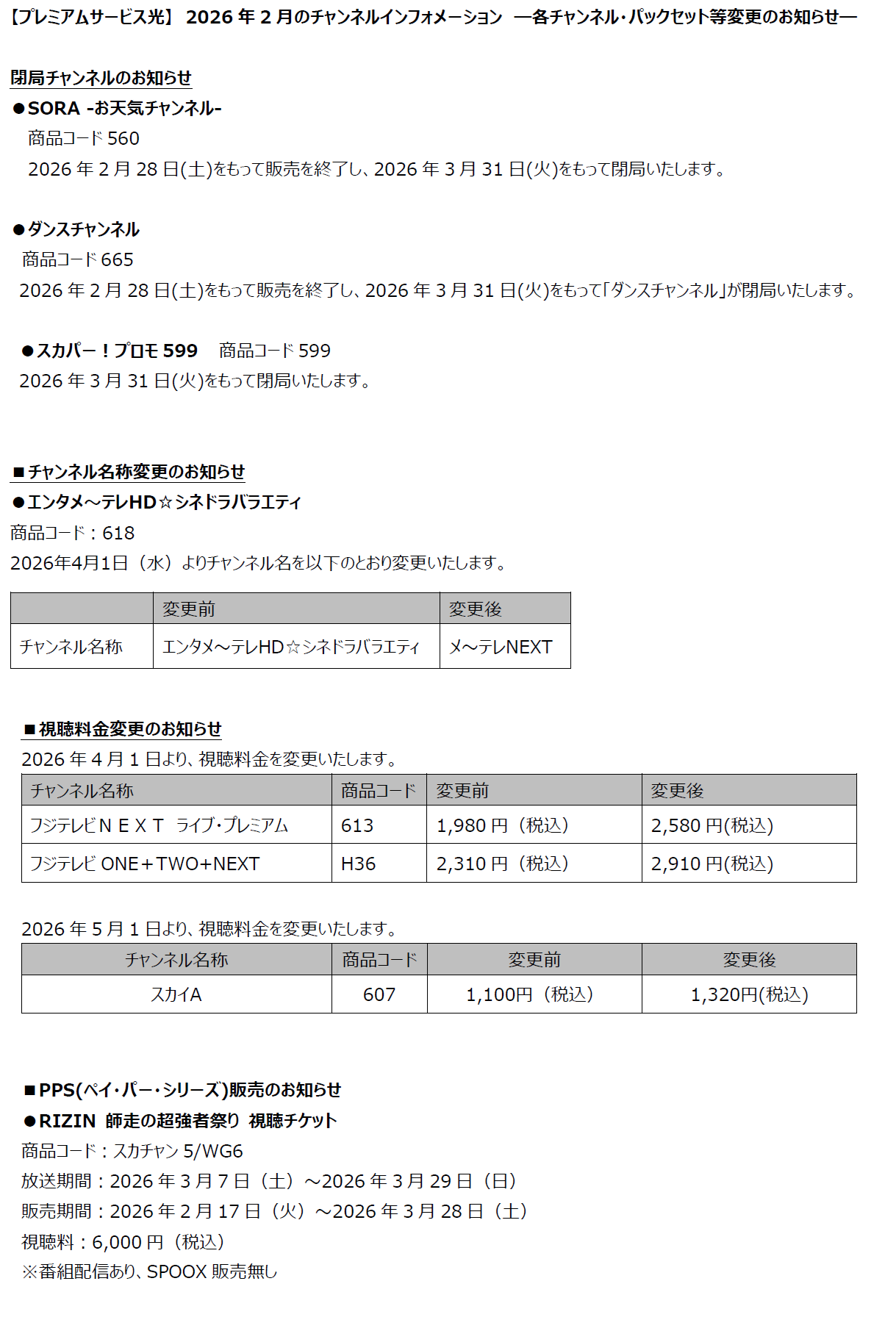 【プレミアムサービス光】2026年2月のチャンネルインフォメーション ―各チャンネル・パックセット等変更のお知らせ―