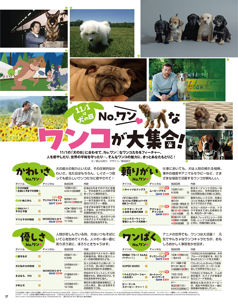 11/1の「犬の日」に合わせて、No.ワンなワンコたちをフィーチャー。そのかわいさや優しさで人を癒やしたり、たくましさで世界の平和を守ったり…。そんなワンコの魅力を堪能できる作品をたっぷり紹介。きっとあなたもワンコのとりこ!