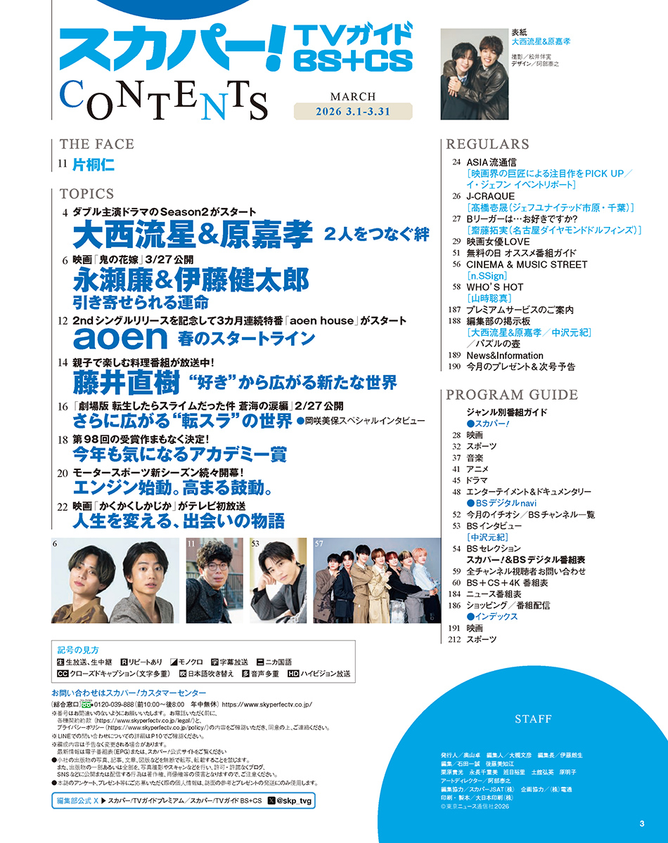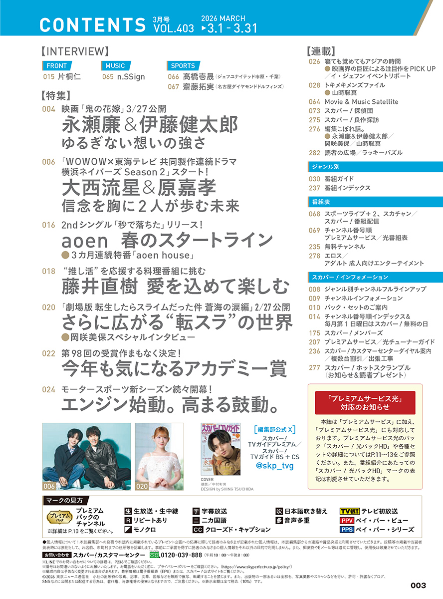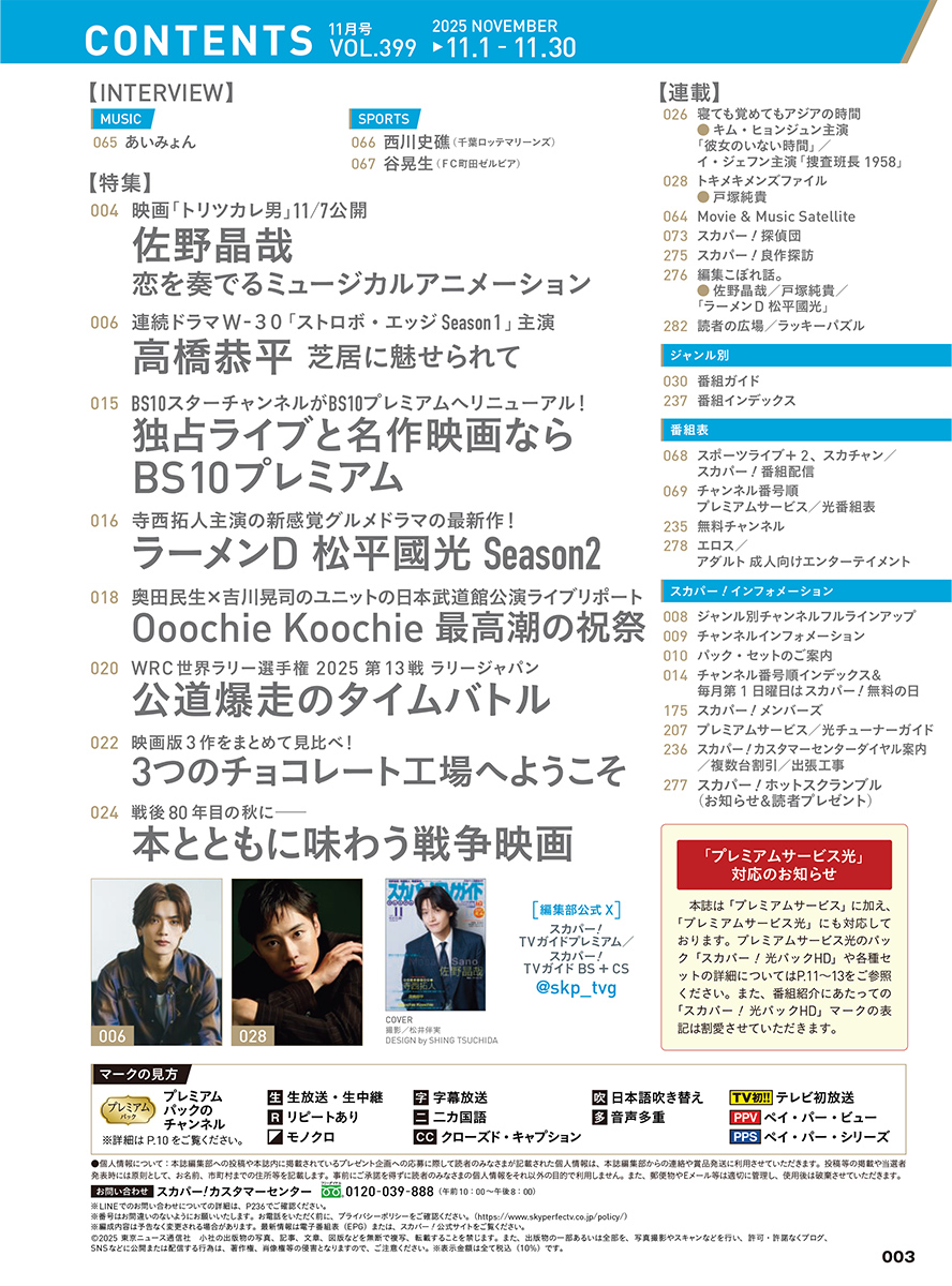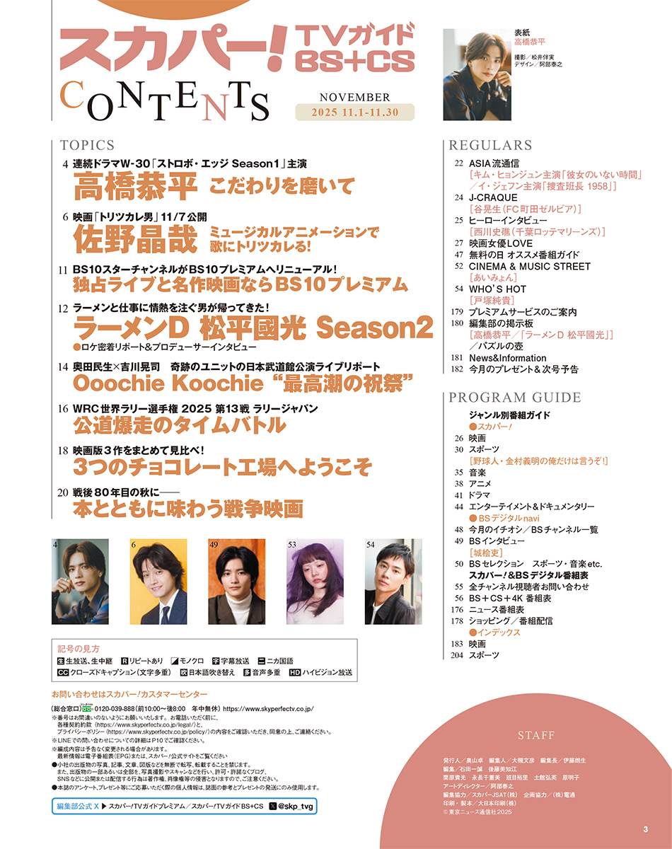 スカパー!・プレミアムサービス・プレミアムサービス光の3サービスに対応、全チャンネルの月間番組表を網羅し、BSデジタル番組表も完備するスカパー!公認ガイド誌です。気になる番組情報はジャンル別に掲載、番組検索には映画、音楽、ドラマ、アニメの便利なインデックスを。編集部独自の切り口による特集や多彩なインタビューなど、充実の内容でお届けします。