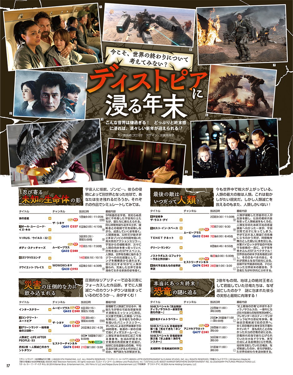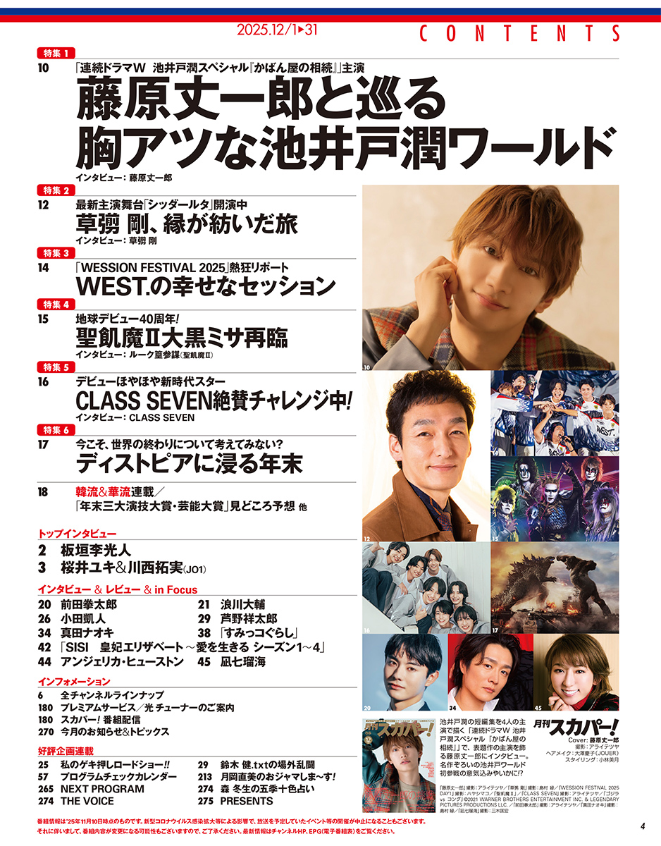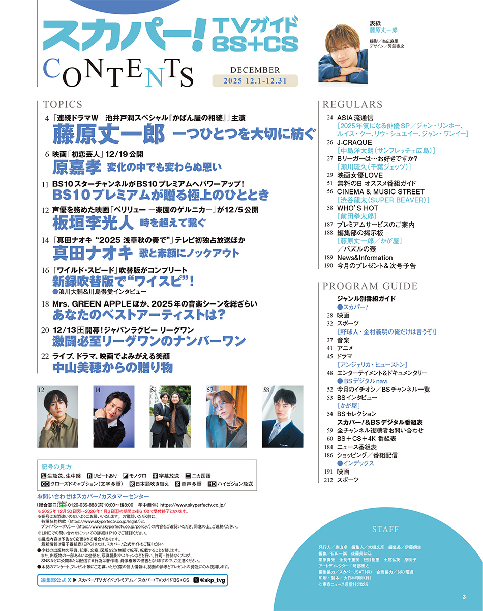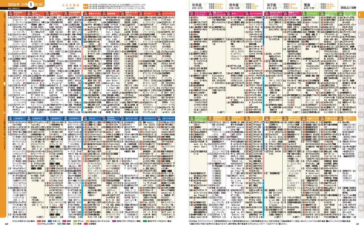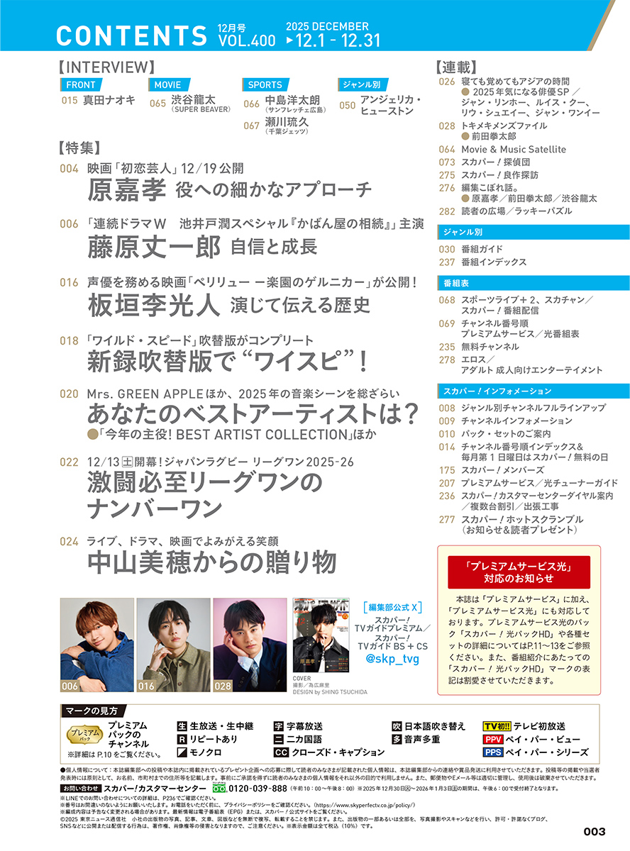 スカパー!・プレミアムサービス・プレミアムサービス光の3サービスに対応、全チャンネルの月間番組表を網羅し、BSデジタル番組表も完備するスカパー!公認ガイド誌です。気になる番組情報はジャンル別に掲載、番組検索には映画、音楽、ドラマ、アニメの便利なインデックスを。編集部独自の切り口による特集や多彩なインタビューなど、充実の内容でお届けします。