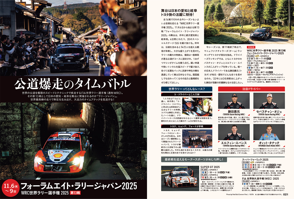 世界の公道を極限のスピードとテクニックで疾走するFIA世界ラリー選手権(通称WRC)。その第13戦として日本の愛知・岐阜を舞台に開催されるのが「ラリージャパン」。世界最高峰の走りで熱狂を生み出す、大迫力のタイムアタックを見逃すな!