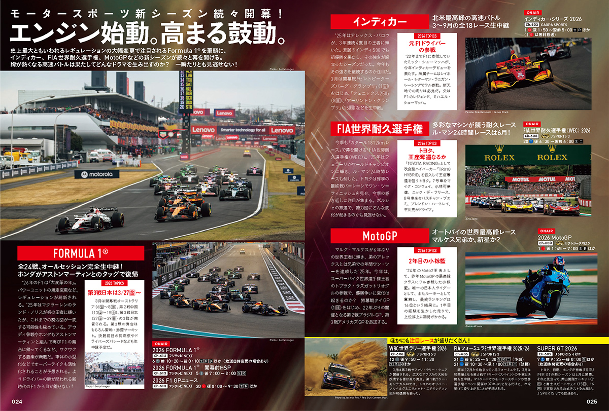 史上最大ともいわれるレギュレーションの大幅変更で注目されるFormula 1®を筆頭に、インディカー、FIA世界耐久選手権、MotoGPなどの新シーズンが続々と幕を開ける。胸が熱くなる高速バトルは果たしてどんなドラマを生み出すのか? 一瞬たりとも見逃せない!